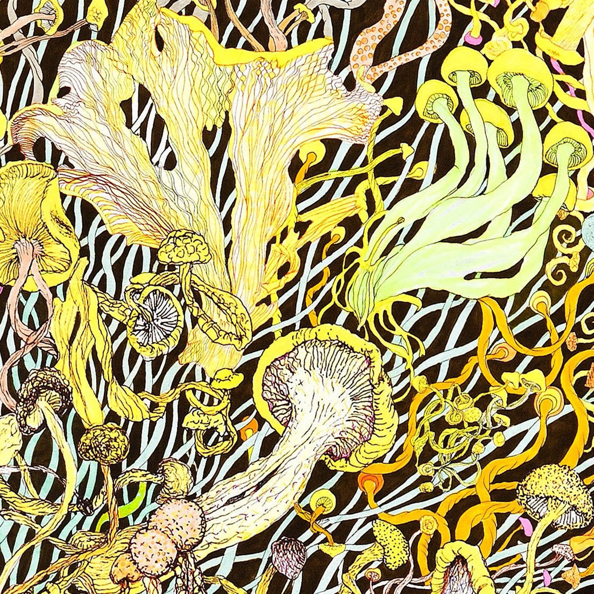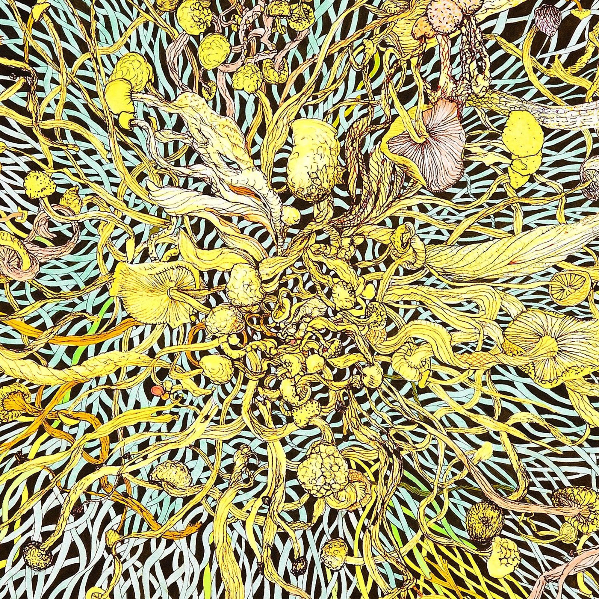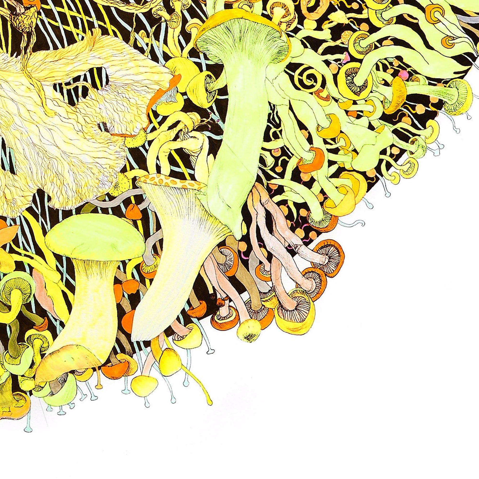 As a counterpart to Fission, Fusion gathers its forms inward. Mycelial lines converge, suggesting union, coherence, and return to center. The drawing meditates on the inward pull of life, the tendency toward relation and wholeness. Taken together, Fission and Fusion articulate a cycle, outward dispersal and inward gathering, through which both fungi and the cosmos sustain themselves.
