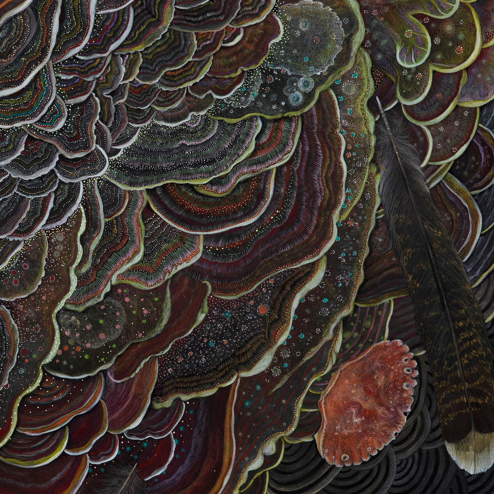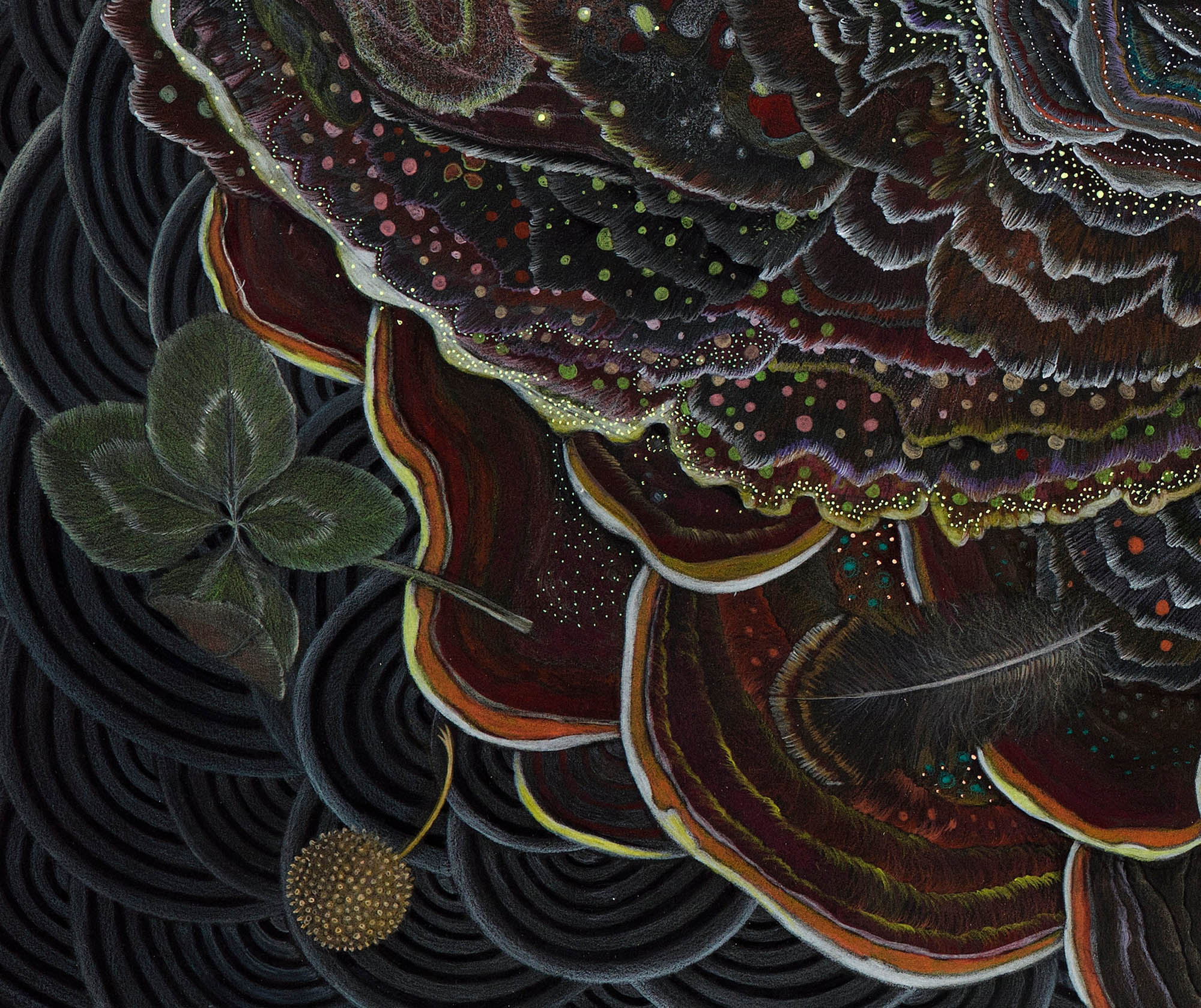 This mandala-like composition gathers natural emblems employed across symbolic traditions. A bird carries the principle of air. A crab shell brings water and protection, the armoring that allows soft life to endure. A rare four-leaf clover speaks to earth and the anomalies of growth beyond the expected triad. Spiraling shelf mushrooms embody time and transformation, the cyclical metabolism by which forests renew. These forms invite multiple elemental readings (air, water, earth, fire, and a fifth principle of space/ether). Here, “fire” is not illustrated as flame but suggested by the generative spiral itself, the inward/outward movement that catalyzes change, while ether is implied by the negative space around the corner forms.